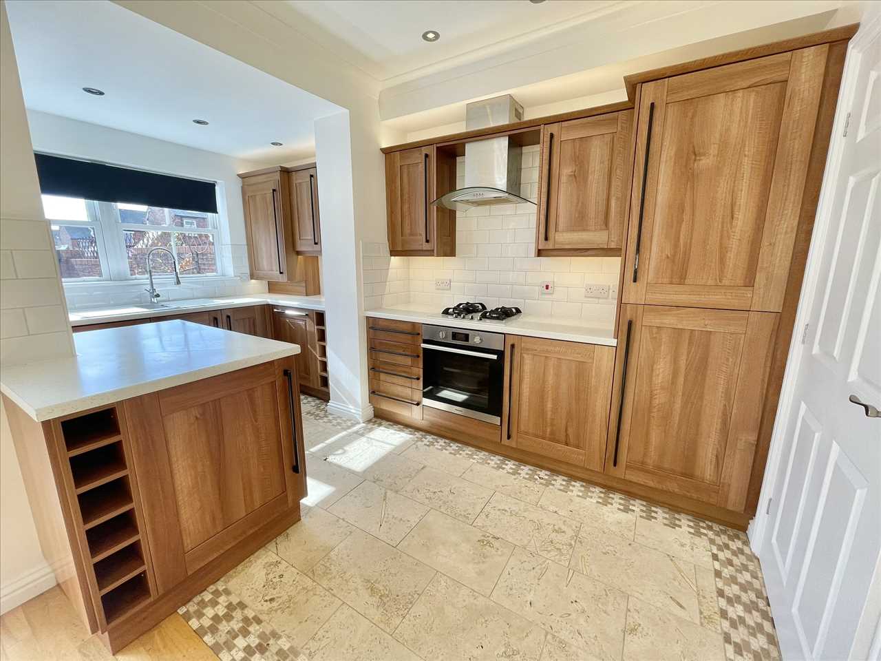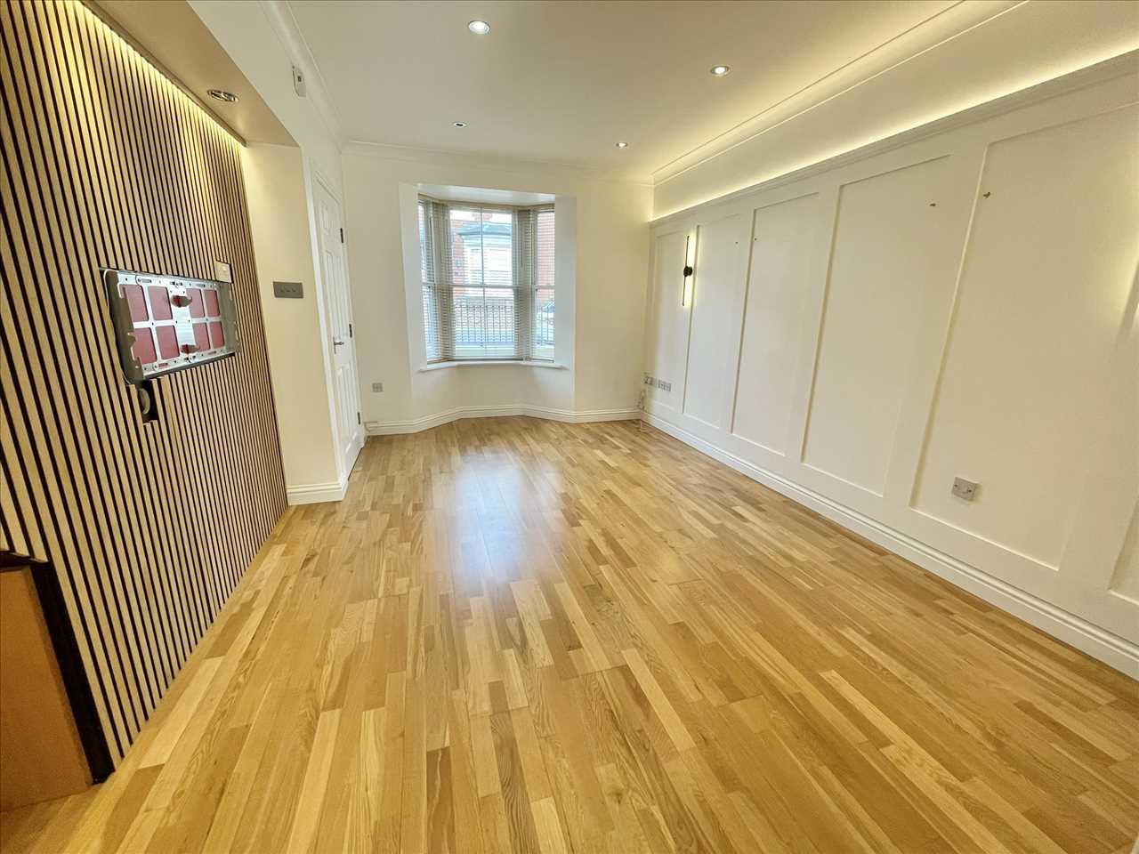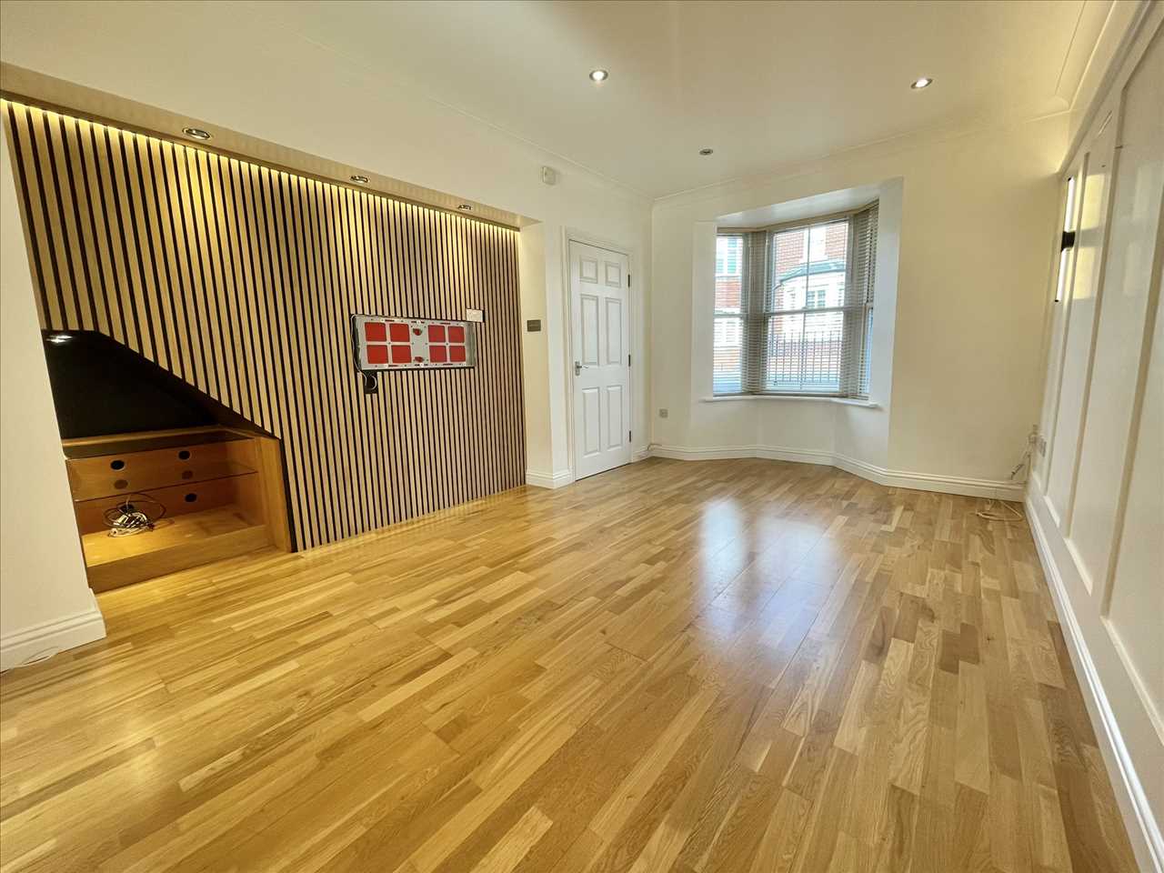 Enigneered oak wood flooring, twin panelled radiator, LED, strip and wall lighting features, feature panel wall and media wall with fittings including wiring for a home cinema system and useful understairs area, upvc sash style double glazed bay window, venetian blinds.