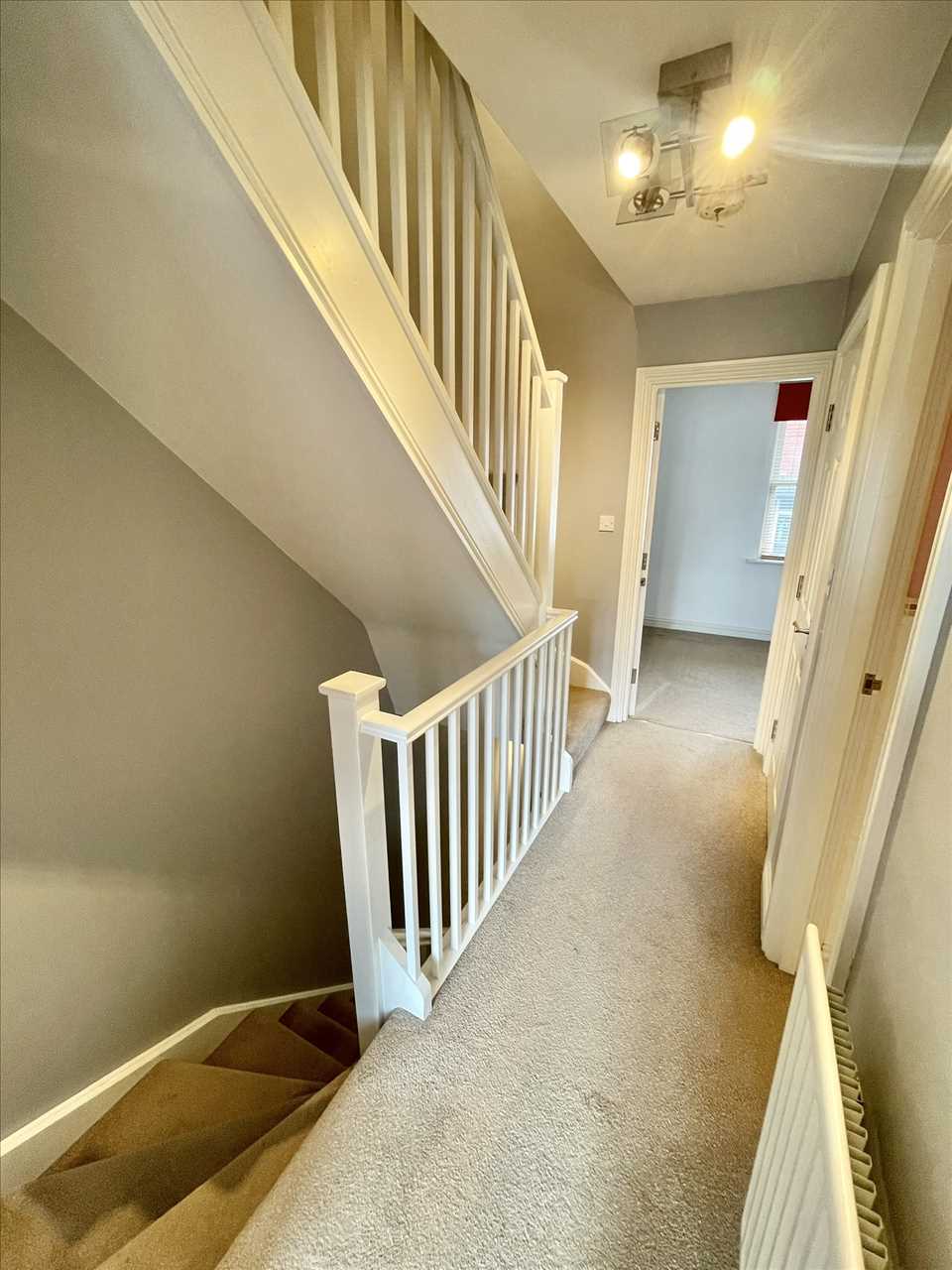 Balustrade with spindles, fitted carpet, radiator.