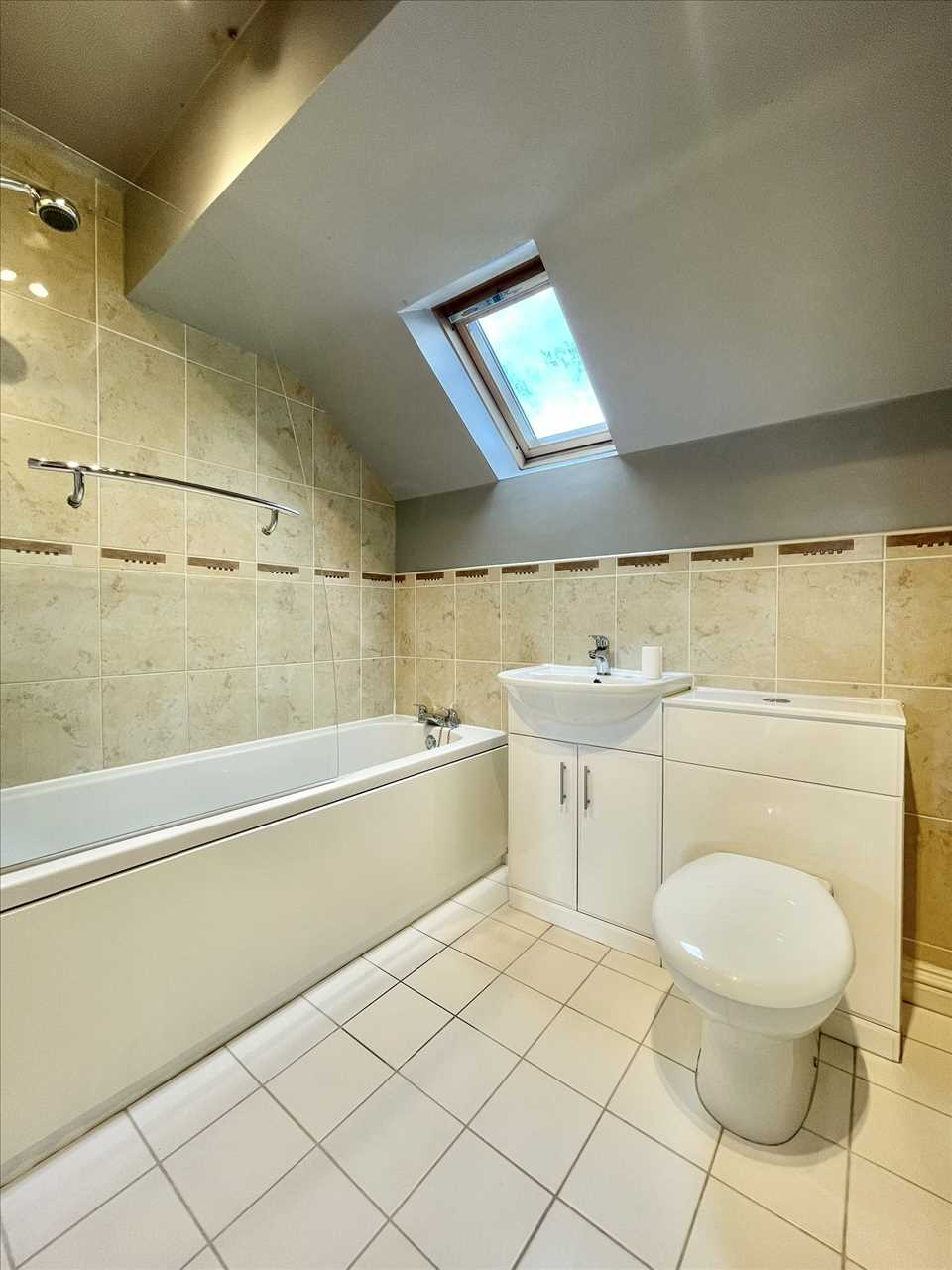 Panelled bath with overhead Mira electric instant hot water shower and shower screen, vanity wash basin/w.c. unit, ceiling extractor, radiator, ceramic tiled floor, mostly tiled walls, Velux double glazed window.