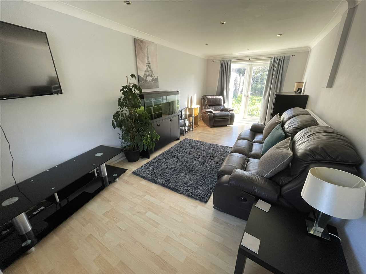 Laminate flooring, radiator, halogen lighting, upvc double glazed bow window to the front, upvc double glazed patio doors to the rear.