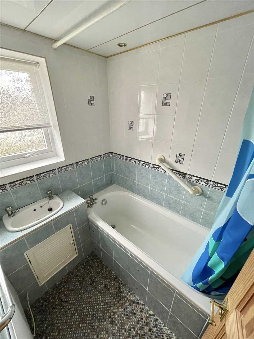 Panelled bath with overhead Aquatronic Ultra 2 electric instant hot water shower, vanity wash basin, fully tiled walls, vinolay flooring, pvc lined ceiling with halogen lighting, electric panel radiator, upvc double glazed window.