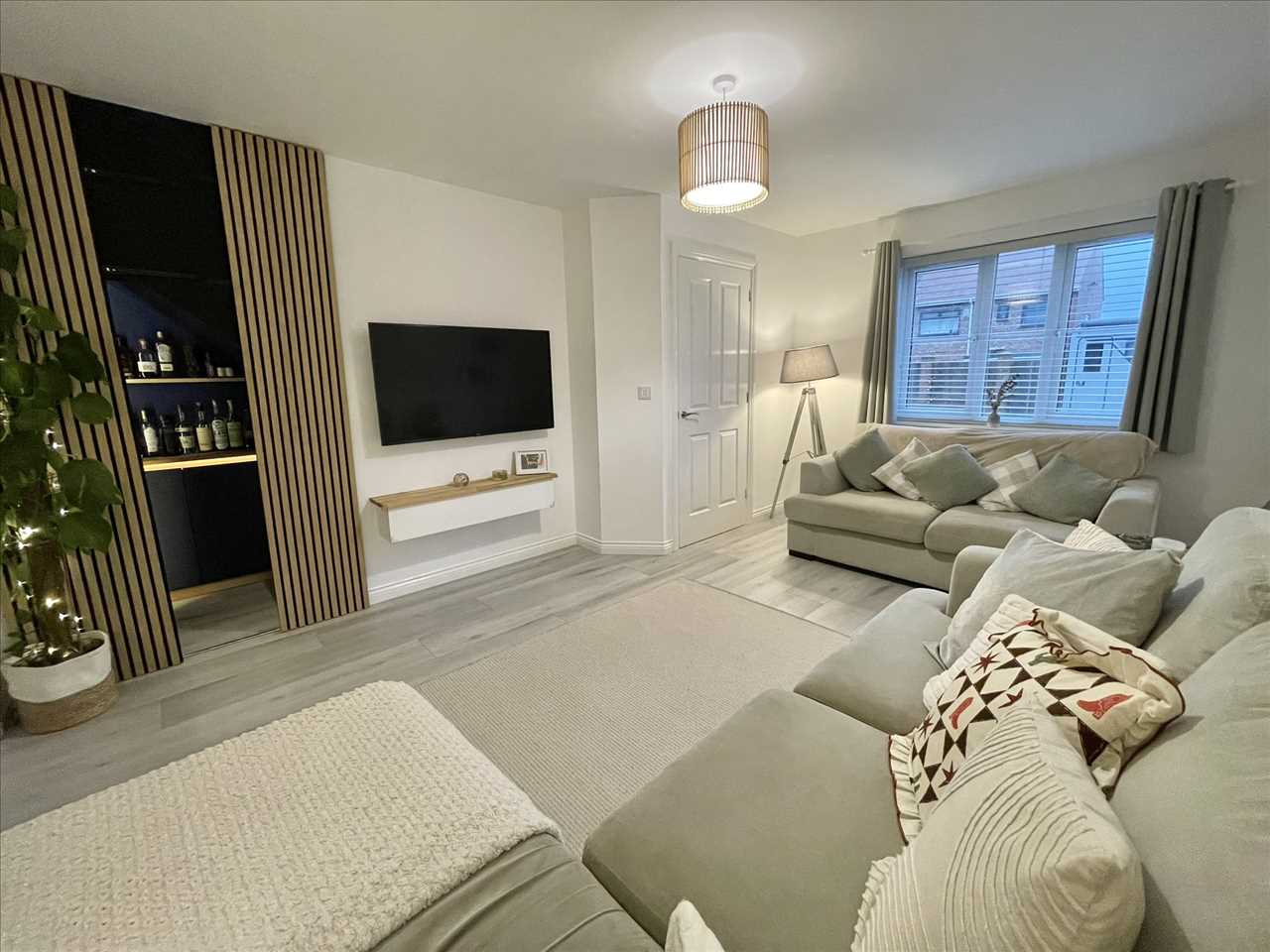 Laminate flooring, radiator, upvc double glazed window, venetian blinds, sliding wall panelling feature opening into understairs bar/storage.