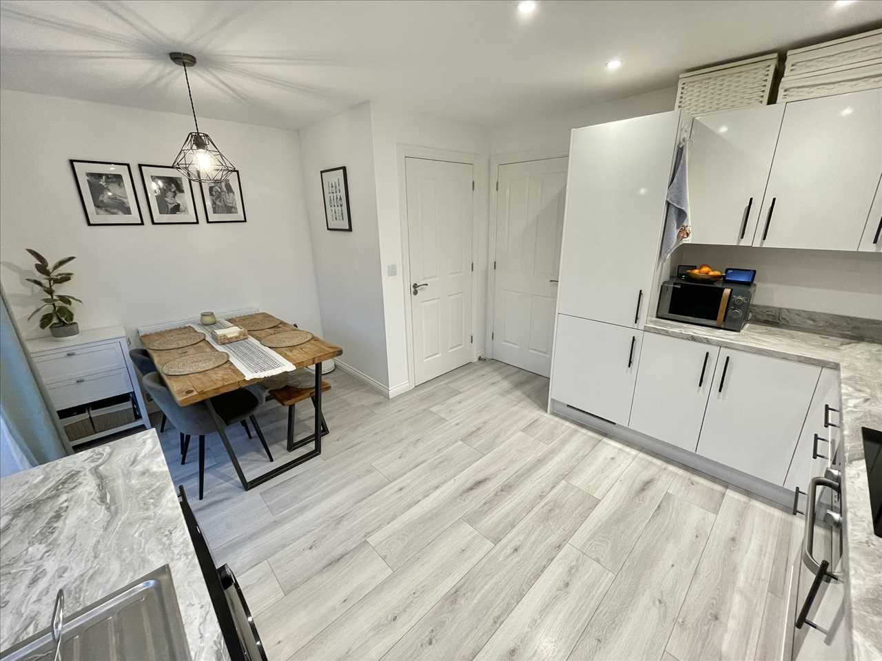 A range of white high gloss fitted wall/floor units, single drainer one and a half bowl stainless steel sink unit with mixer tap, built in oven/ceramic hob/overhead extractor hood, integrated dishwasher/fridge/freezer, plumbing for washer, cupboard with Baxi gas combination central heating boiler, laminate flooring, LED lighting, radiator, upvc double glazed window, venetian blinds, upvc double glazed patio doors, door to ground floor w.c..