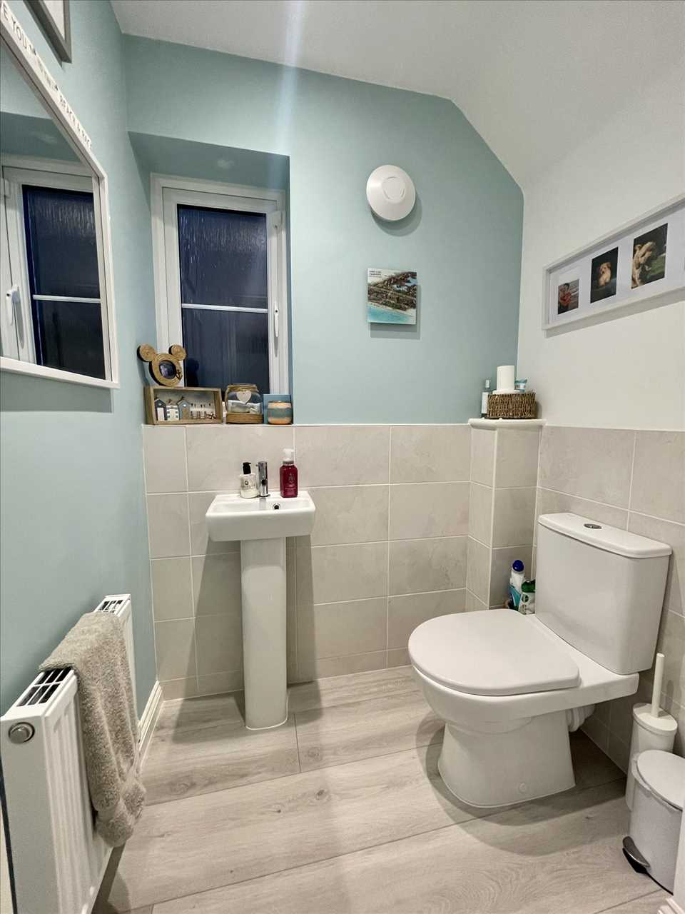 Low level suite, pedestal wash hand basin, part tiled walls, radiator, laminate flooring, upvc double glazed window.