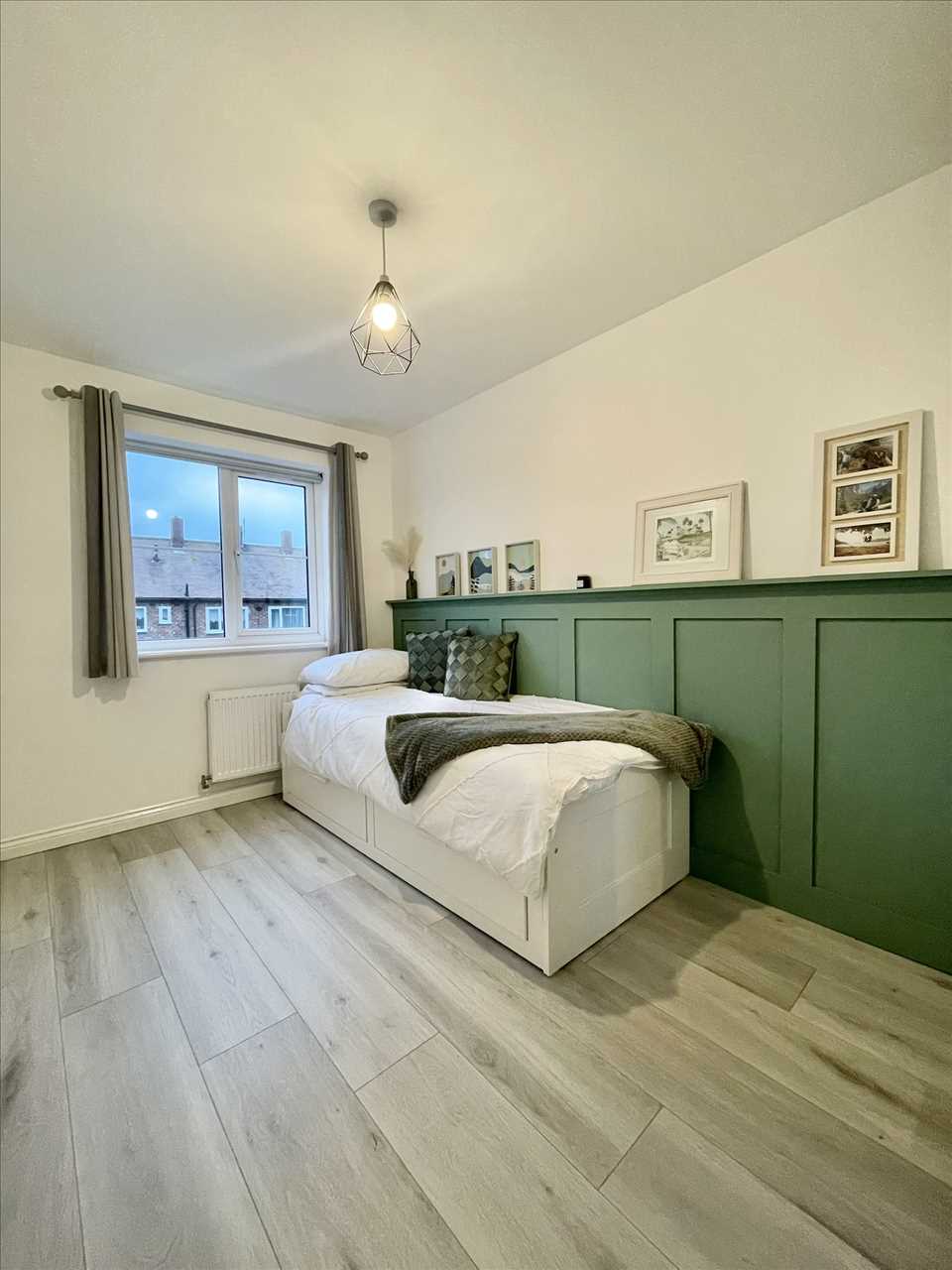 Laminate flooring, two radiators, two upvc double glazed windows, roller blinds, panelled wall feature.