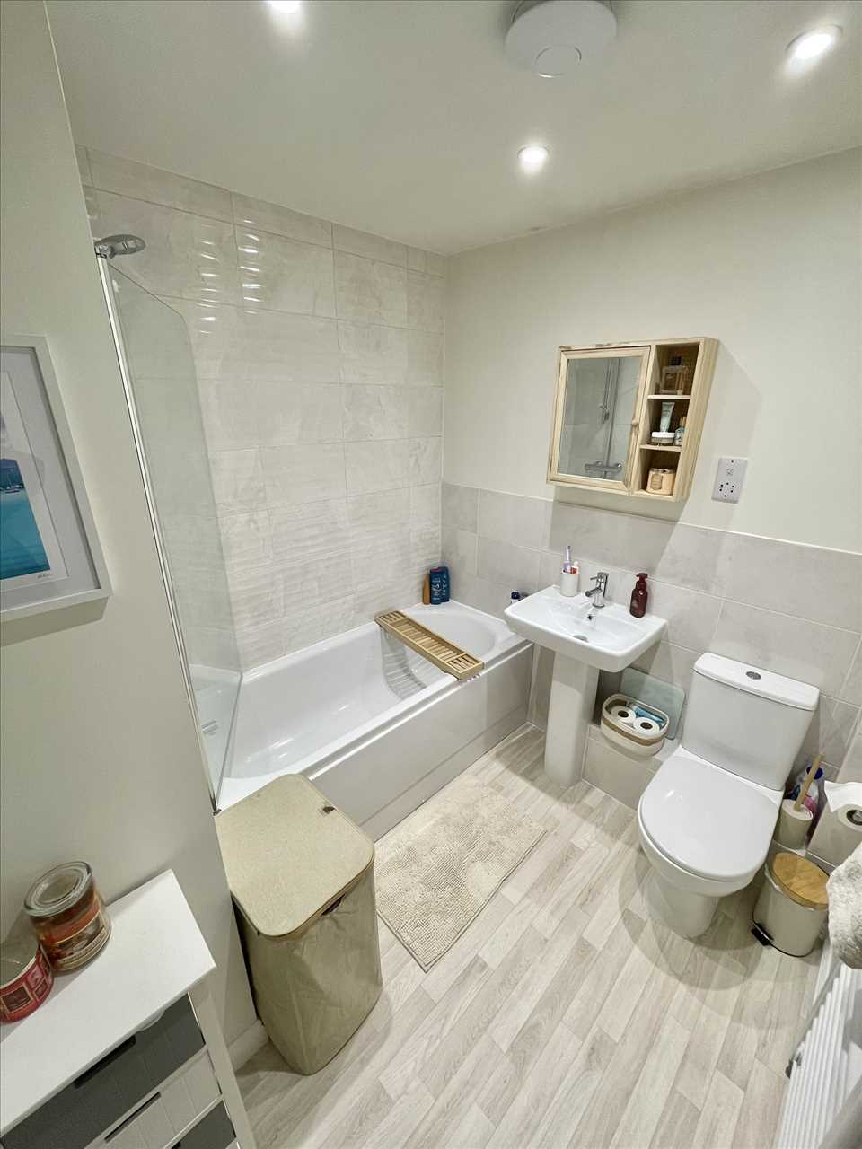 Panelled bath with overhead chrome plumbed shower and shower screen, low level w.c., pedestal wash hand basin, part tiled walls, laminate flooring, white towel radiator, LED lighting.