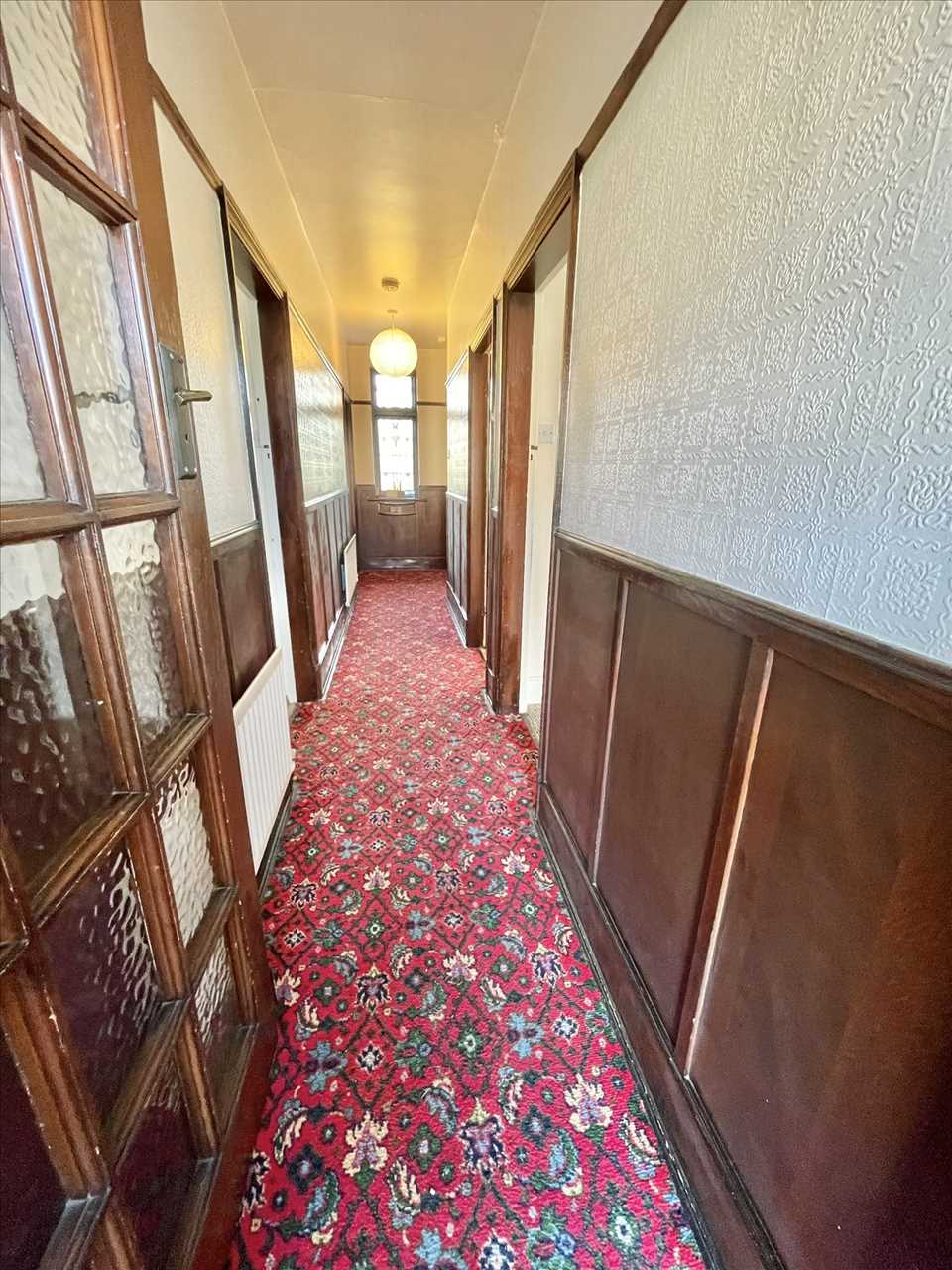 Timber front door, fitted carpet, glazed inner door opening into the hall with fitted carpet, part panelled walls, two radiators, timber framed single glazed leaded stained glass window, cloaks cupboard.