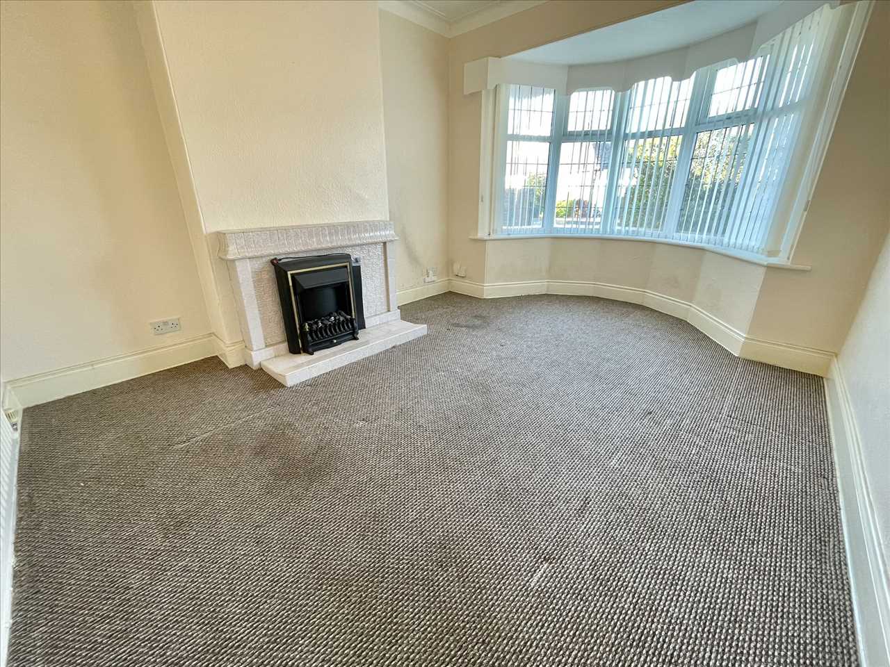 Tiled fireplace surround with electric fire, fitted carpet, radiator, upvc double glazed bay window, vertical blinds.