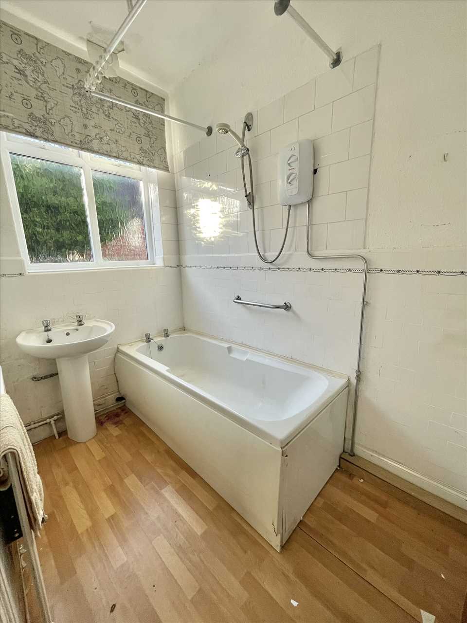 Panelled bath with overhead Redring Expressions electric shower, pedestal wash hand basin, part tiled walls, radiator, vinolay flooring, ceiling extractor, upvc double glazed window, roller blind.