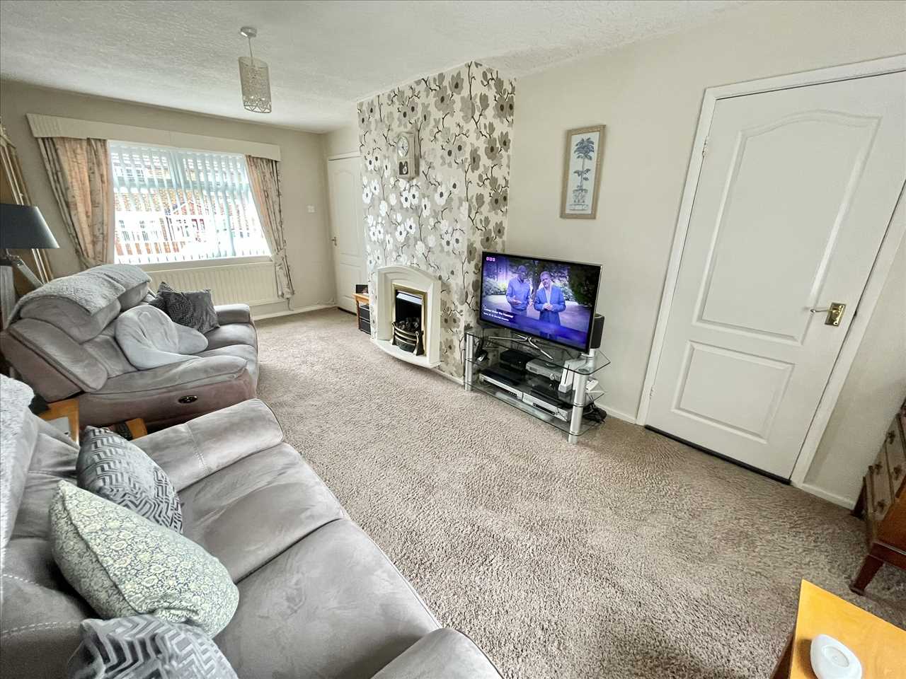 Feature hole in the wall style fireplace with inset living flame coal effect gas fire, fitted carpet, two radiators, vertical blinds, front and rear upvc double glazed windows.