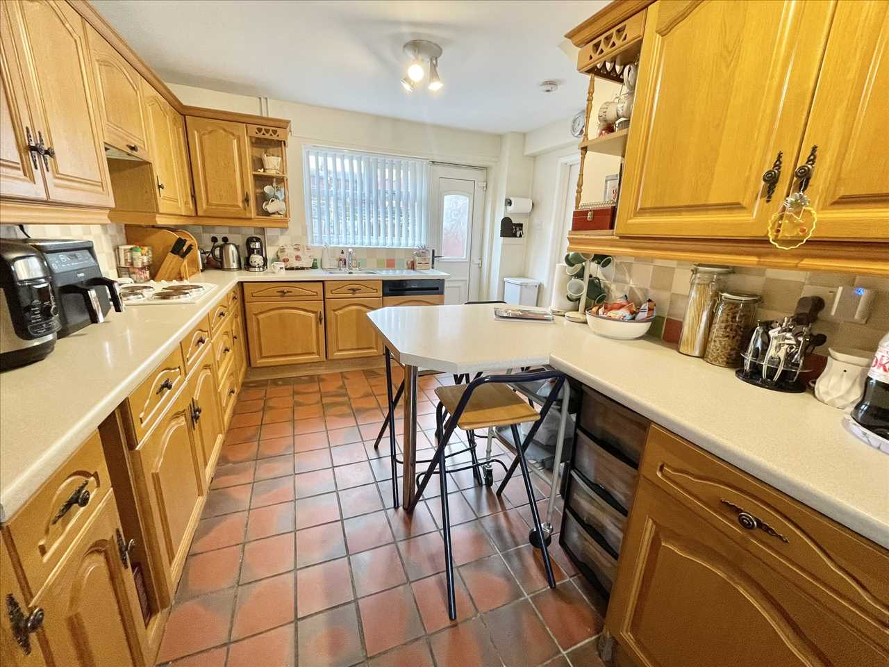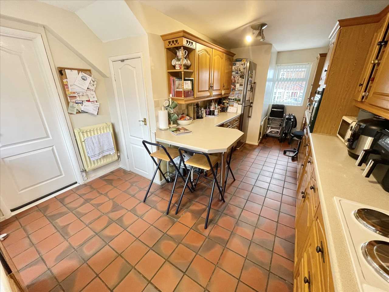 An extensive range of oak wood fronted fitted wall/floor units including some glazed fronts, built in breakfast bar, built in computer desk, wine rack, single drainer one and a half bowl stainless steel sink unit with mixer tap, integrated dishwasher and washing machine, built in electric hob, concealed overhead extractor hood, built in oven, complementary inset wall tiling, quarry tile flooring, twin and single panel radiators, upvc double glazed windows to the front and rear, upvc double glazed back door, vertical blinds, understairs cupboard.