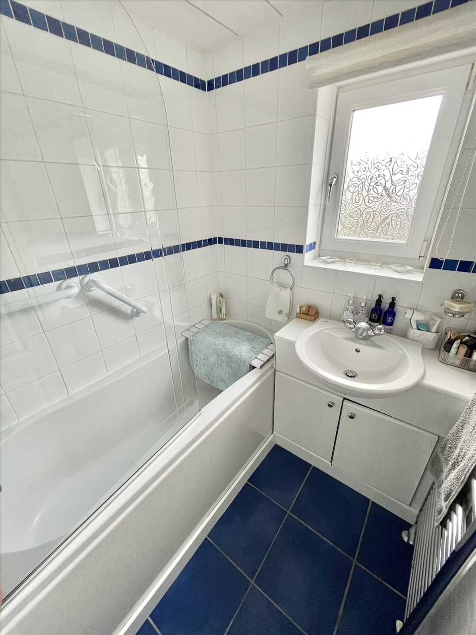 Panelled bath with overhead Redring electric instant hot water shower and shower screen, vanity wash basin, chrome towel radiator, fully tiled walls, pvc lined ceiling with halogen lighting, ceiling extractor, ceramic tiled floor, upvc double glazed window.