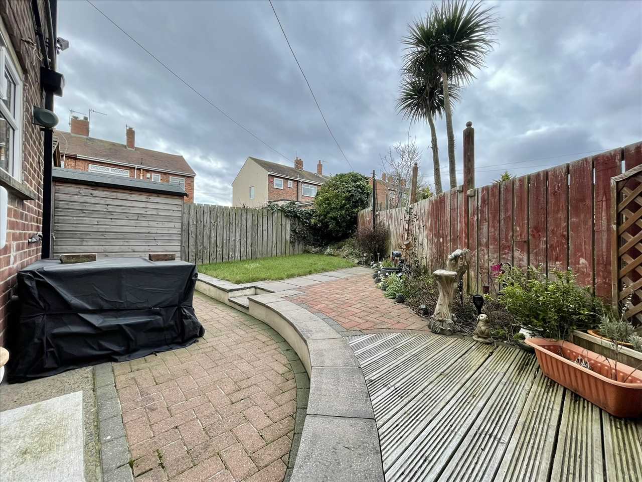 The property has a front lawn with adjoining car standage space and side gate leading to the rear garden. The rear garden includes a small lawn, block paving and decking features, exterior lighting, outside tap and a garden shed.