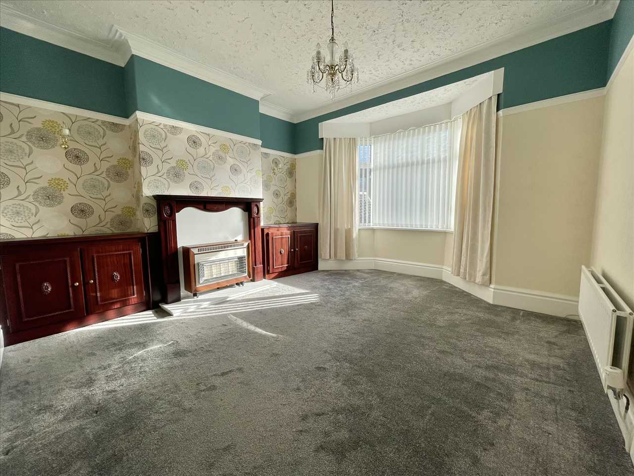 Stained wood fireplace surround with marble inset and matching alcove cupboards, fitted gas fire, fitted carpet, twin panelled radiator, picture rail, two wall lights, upvc double glazed bay window, vertical blinds.