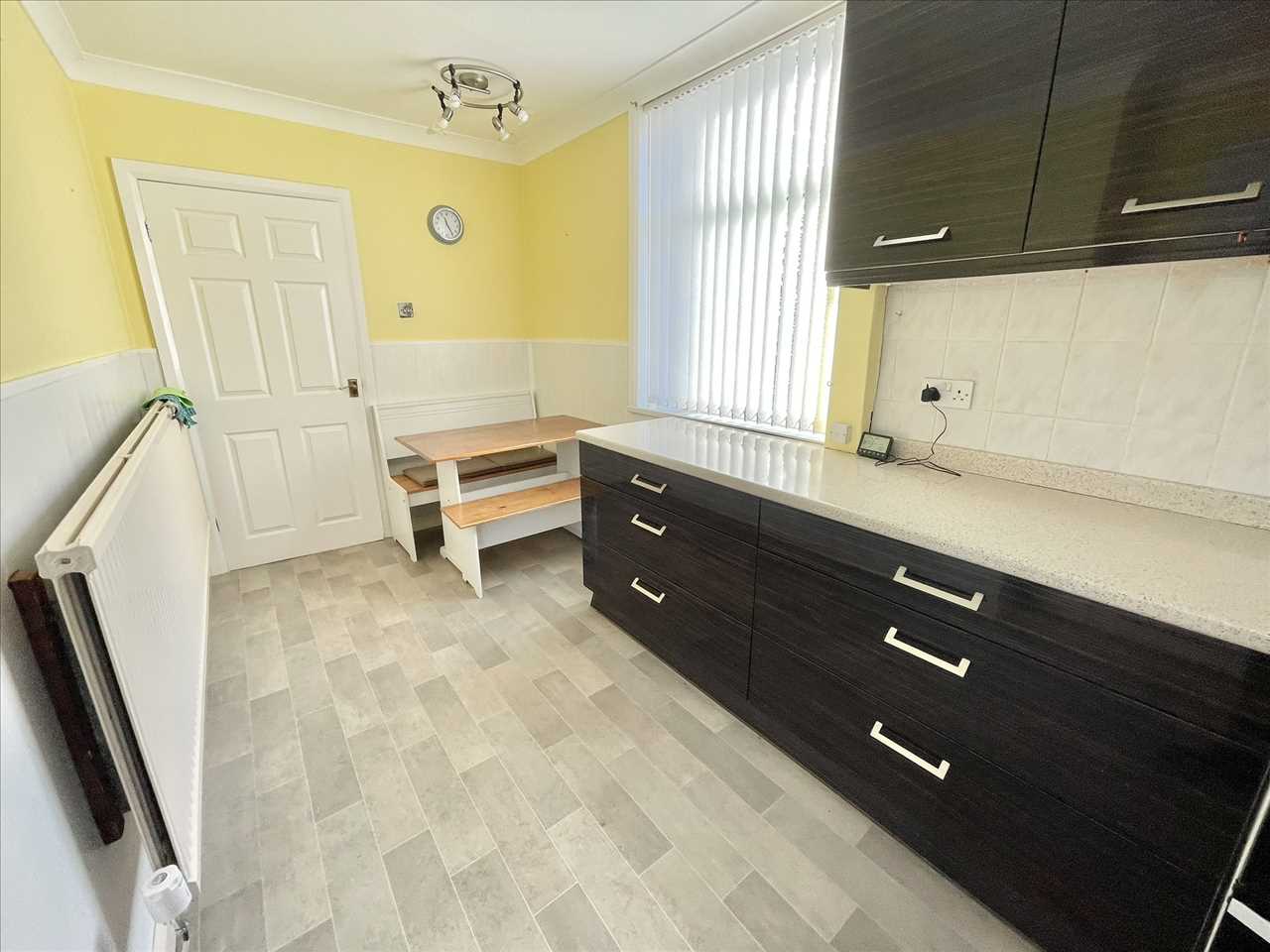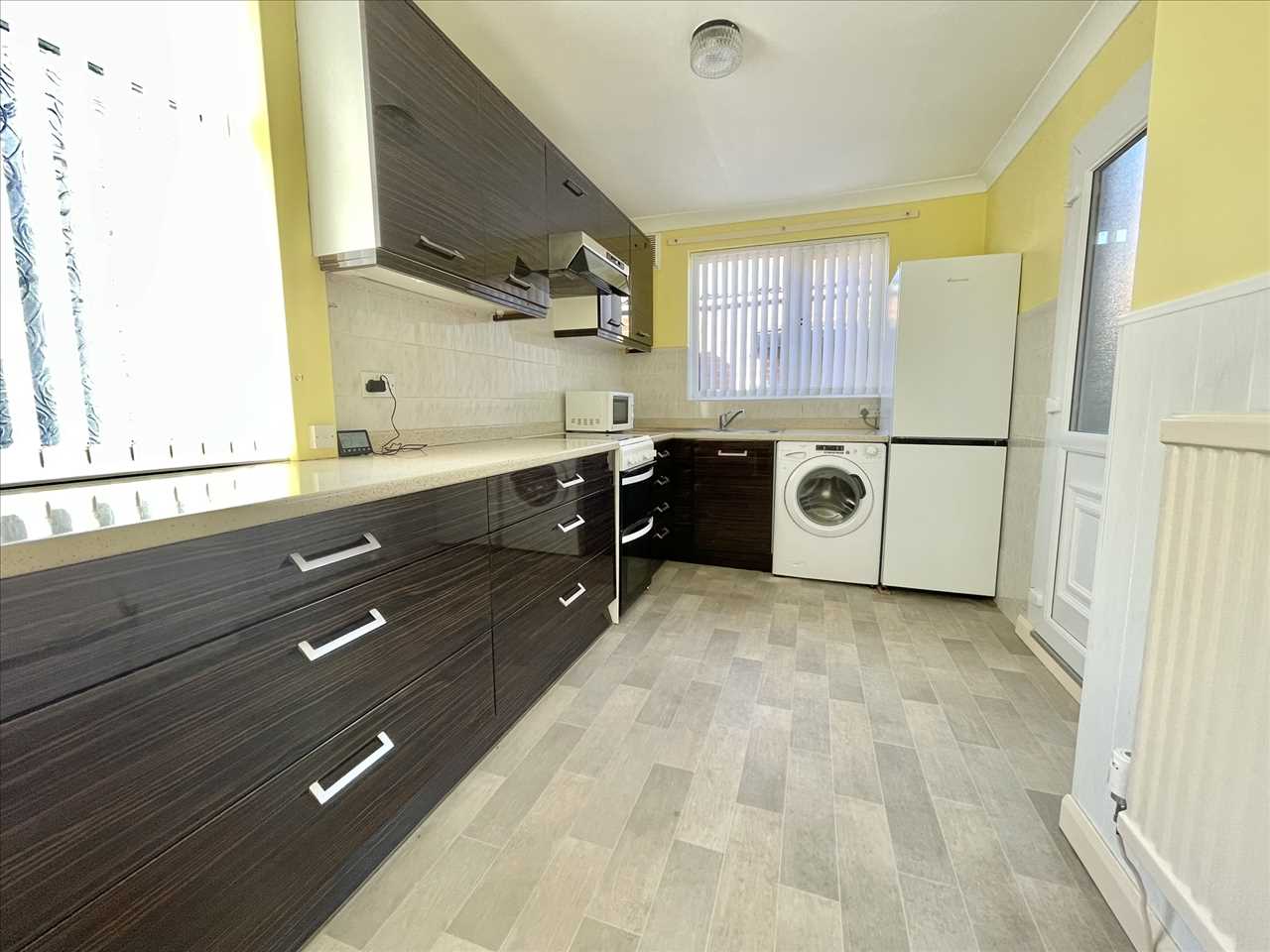 A range of high gloss fitted wall/floor units, single drainer one and a half bowl stainless steel sink unit with mixer tap, complementary inset wall tiling, electric cooker point, overhead extractor hood, plumbing for washer, twin panelled radiator, ceiling coving, vinolay flooring, part pvc wall cladding, rear and side upvc double glazed windows, vertical blinds, upvc double glazed back door.